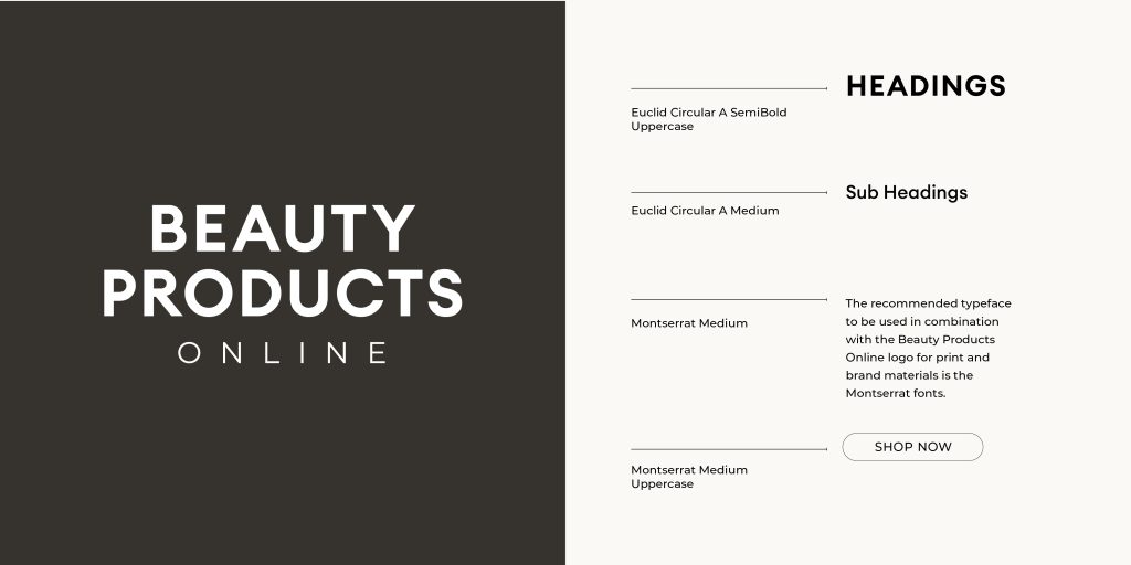 The Beauty Products Online brand exudes sophistication, simplicity, and contemporary flair. Its subtle color palette graciously allows the products to shine in the spotlight. While the typography may appear simple, it wields an elegant boldness that leaves a lasting impression.