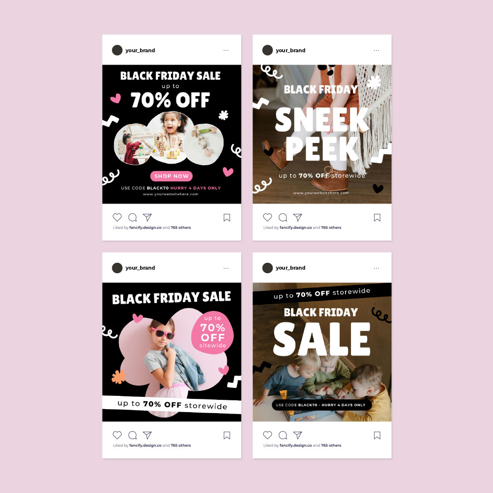 Get ready to shine this Black Friday with our playful, bright, and totally fun Canva Templates for children, kids, and baby brands! Bursting with bold shapes and vibrant colours, these templates are designed to grab attention and make your brand stand out from the crowd. Whether you’re gearing up for a big sale or a special promotion, these easy-to-edit templates will have you ready to go in no time – just drop in your images, tweak the text, and you’re set! Perfect for Facebook ads, Instagram, or email blasts, they make your Black Friday promo a breeze while keeping things cheerful and kid-friendly.